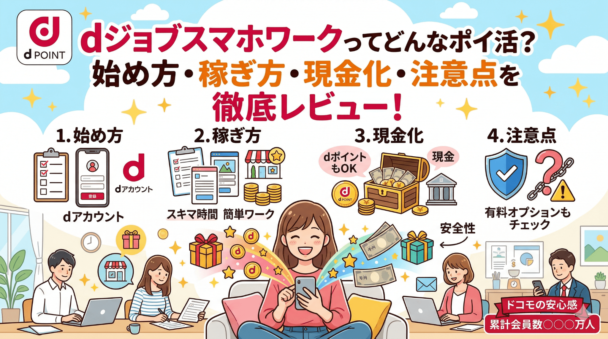 dジョブスマホワークは、ドコモ運営の無料ポイ活サービスで、アンケートやモニター、アプリ広場、登録案件などを通じてdポイントまたは現金を貯められるのが魅力です。
