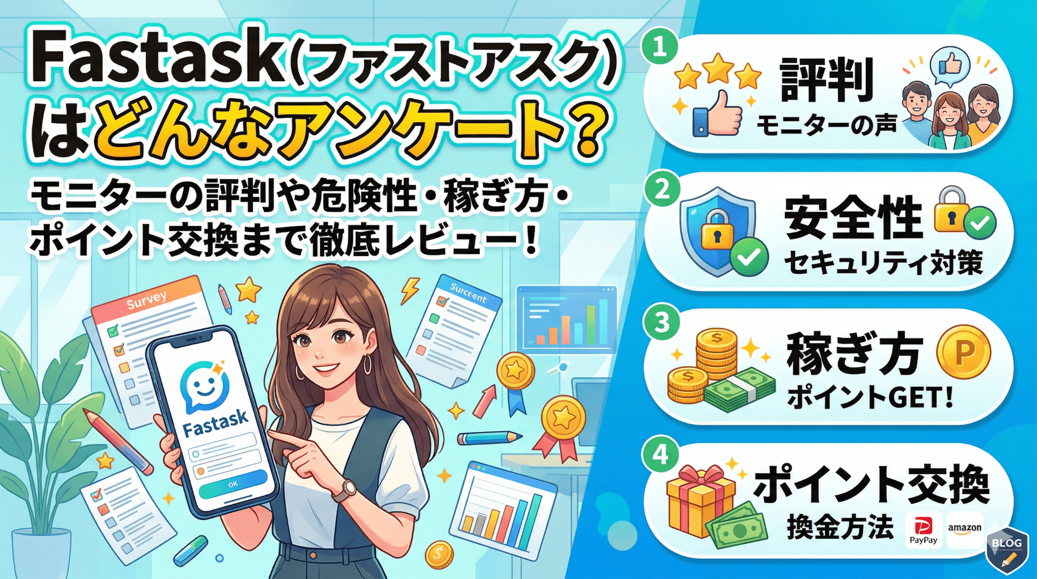 Fastask(ファストアスク)は、ジャストシステム運営のアンケートアプリで、10年超の実績、3,000社超の調査主利用、PeX経由の幅広い交換先、高単価インタビュー案件が特徴です。